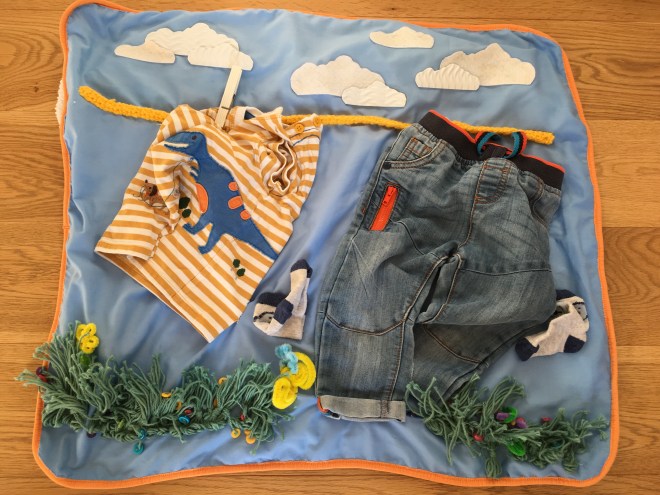 When Quinns is in the car he doesn’t have a table but it’s a perfect opportunity for working on finger function. This is where Oma comes in. She’s made Quinns a busy blanket with some of his old clothes and bits & pieces she had lying around. It sits comfortably on his knee for long journeys and gives him something to do.